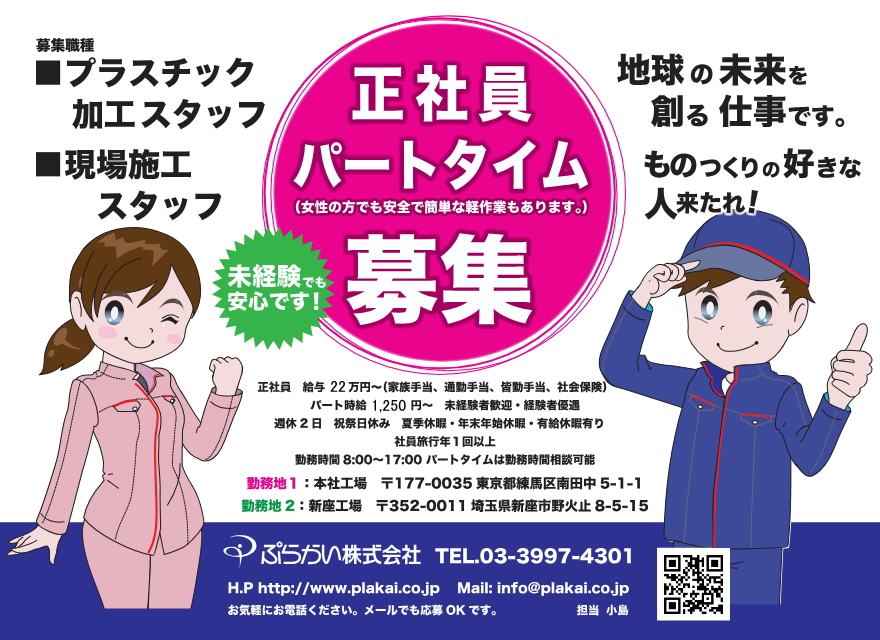 | 連絡先 | TEL.03-3997-4301 お気軽にお電話ください。メールでも応募 OK です。 H.P: https://www.plakai.co.jp Mail: info@plakai.co.jp 担当 小島 |