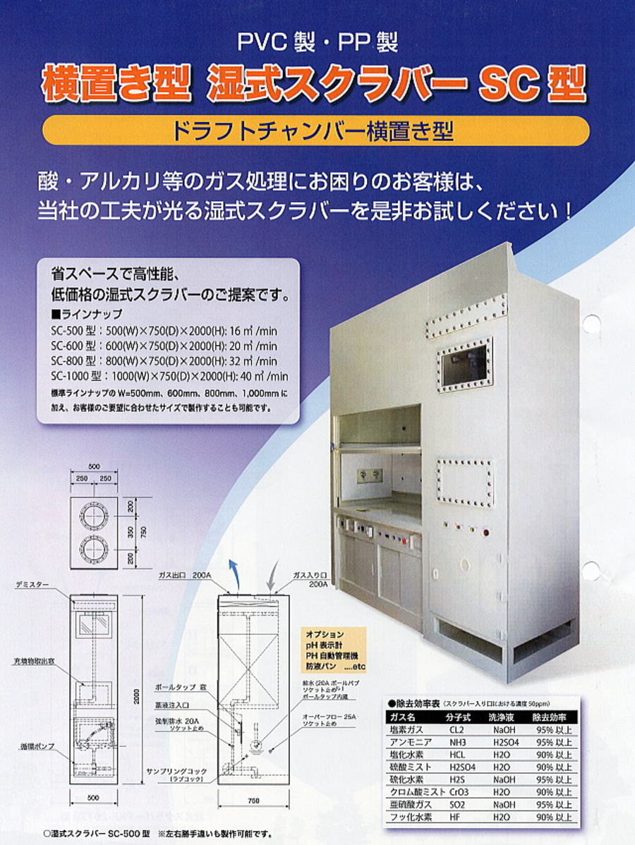 | 省スペースで高性能、低価格の湿式スクラバーのご提案です! ドラフトチャンバー横置き型 PVC製・PP製、酸・アルカリ等のガス処理にお困りのお客様は、当社の工夫が光る湿式スクラバーを是非お試しください。 |